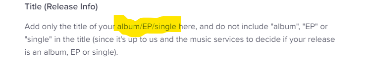 Add only the title of your album/EP/single here, and do not include āalbumā, āEPā or āsingleā in the title (since itās up to us and the music services to decide if your release is an album, EP or single).