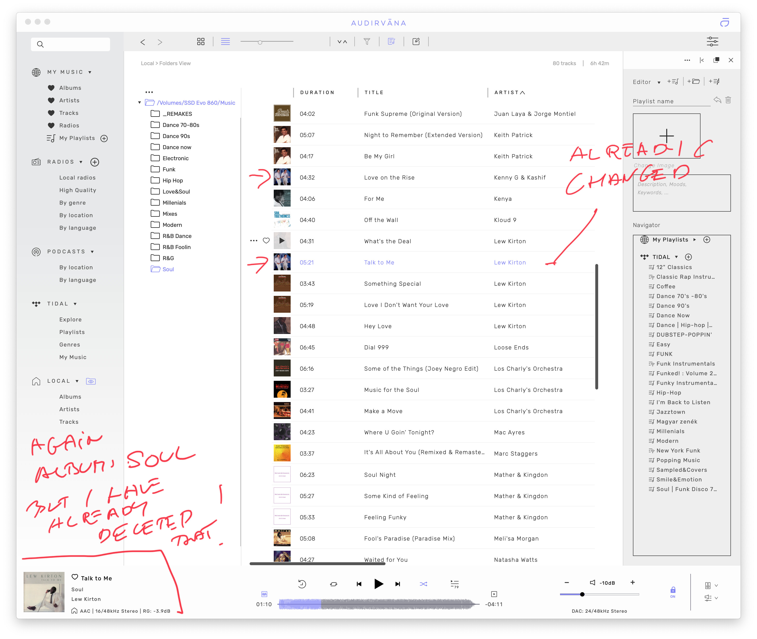 I have made changes outside of Audirvana, with Tag editor Pro, I have took out the extra wrong infos like Album: Soul, Album Artist: Music, I have saved them all, and Audirvana put back wrong shits. Sorry guys, but that is so annoying and I think now you turn! Now, You know all the bug infos to should fix.