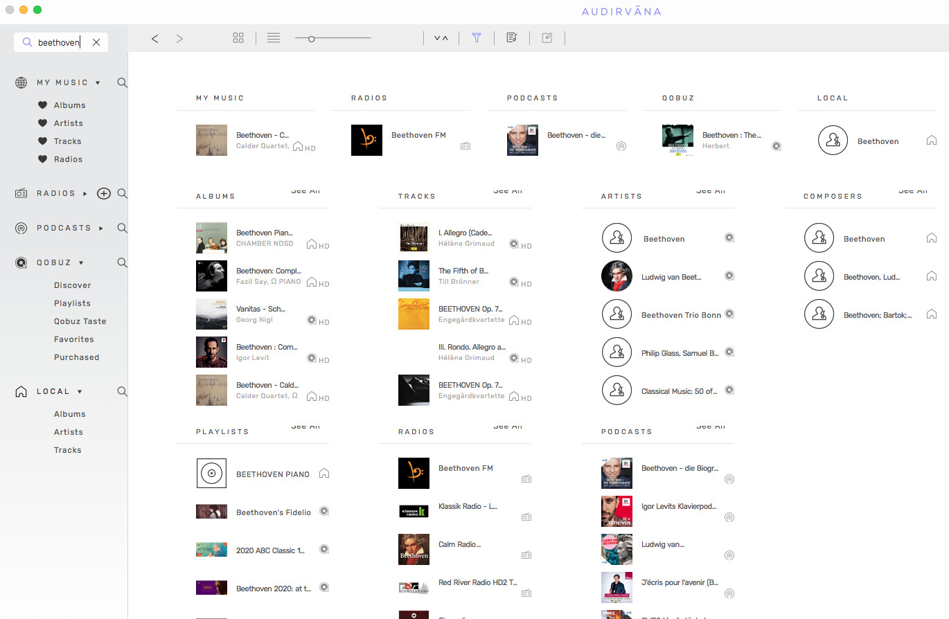 Search button works here (see attached) I think it is messy and NOT clear in the results. I’m preferring the results from my local files would be better at top of screen. When I click LOCAL I get the second result and I have to click SEE ALL for all the Beethoven.