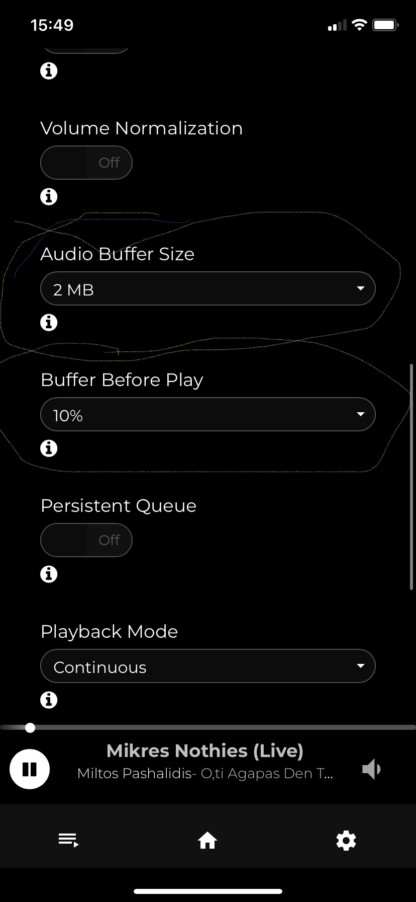 I have 32MB as audio buffer size and 30% as buffer before play and I do not have the loading behavior you have.