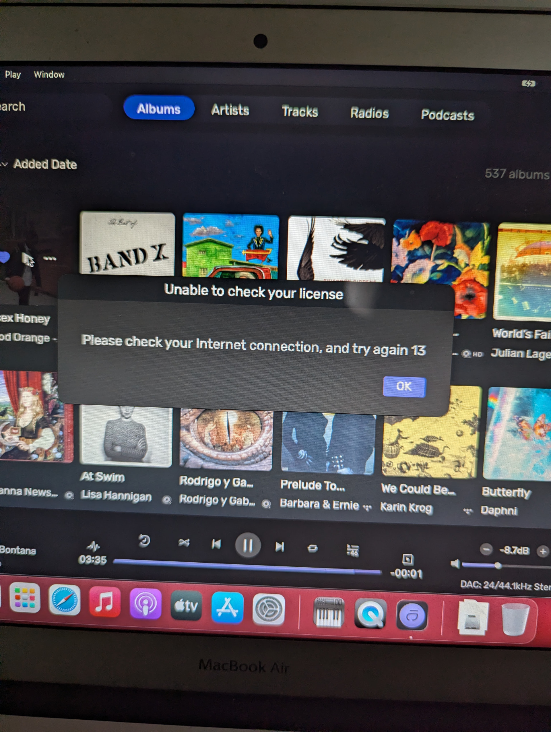 Itās happening to me also and I never had any issues at all in all the previous versions. Iāve removed previous licenses, checked my wifi and changed ethernet cables, plus reinstalled twice. The ācannot verify the license 13ā warning pops up still and is sperratic. Touching the ok button in the warning immediately shuts down Audirvana. I havenāt found a solution yet. If I do I will post the solution.