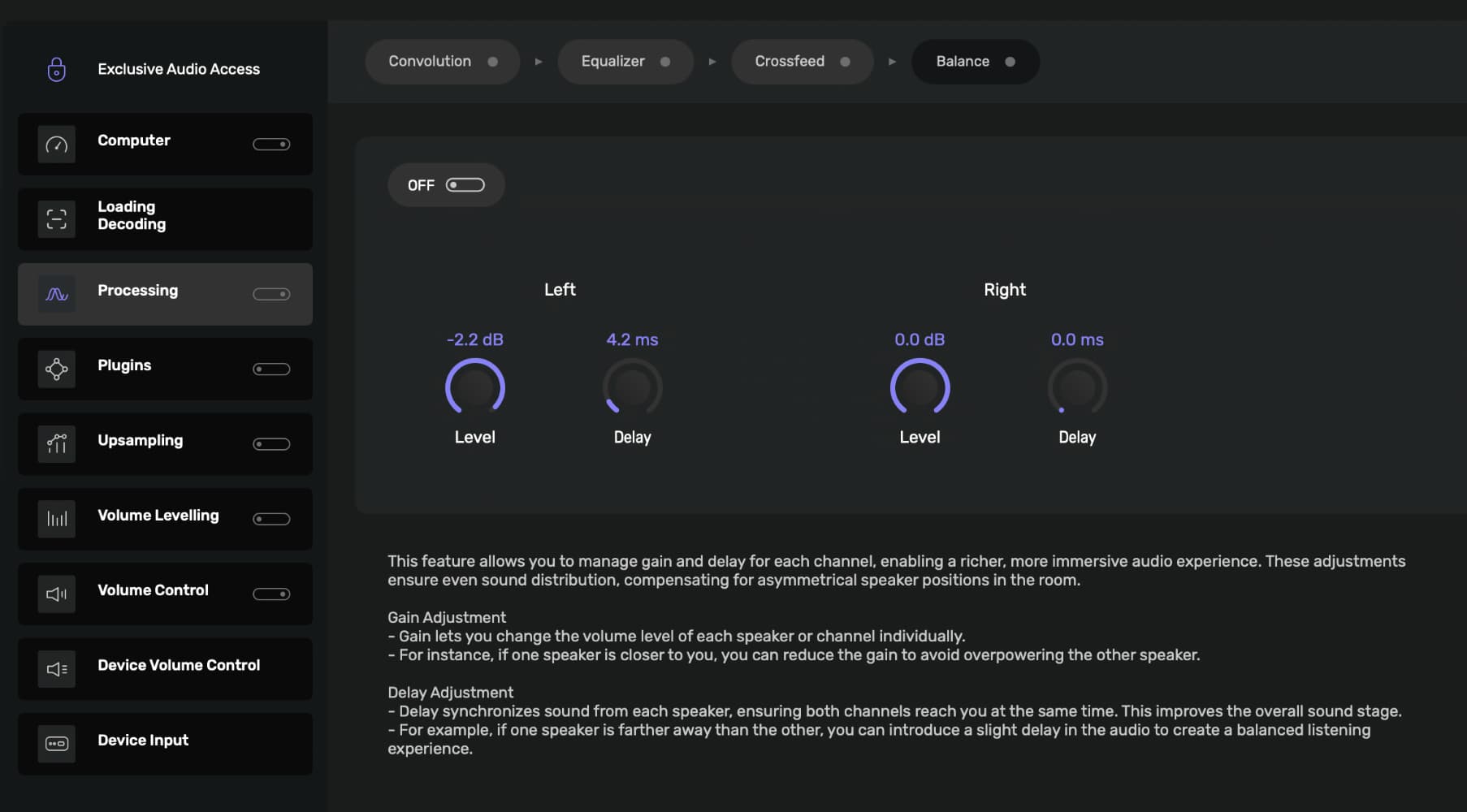 I have processing enabled with balance set with attenuation and delay for the left speaker. With processing disabled the album plays fine but immediately crackles when enabled.