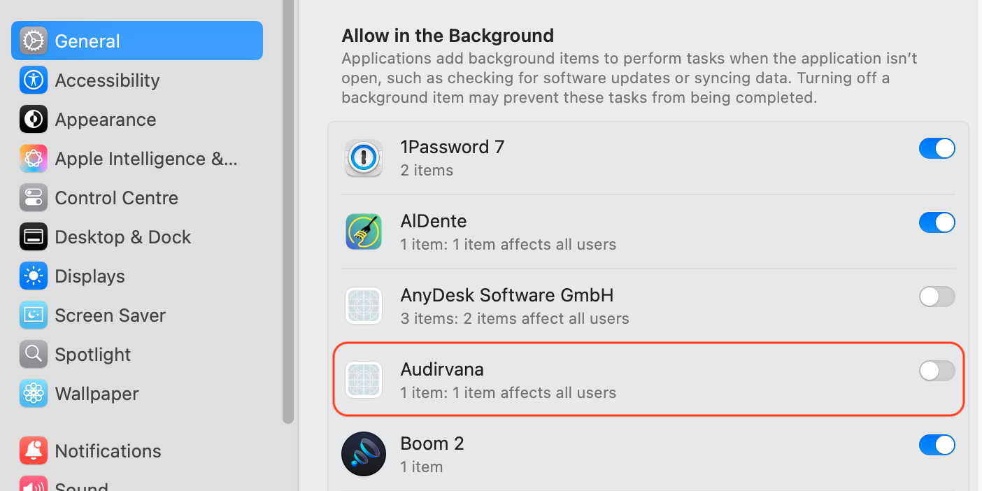 I decided not to use Audirvāna for the time being. How can I get rid of its Background task? I removed the app, deleted its preference file, after some searching found and deleted SysOptimizer file also, But there is still Audirvana listed in the System’s Background tasks.