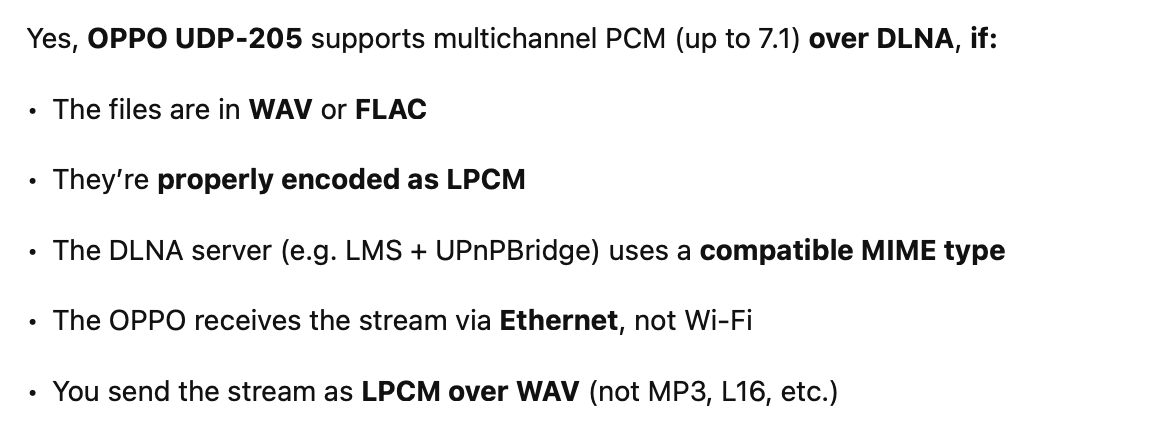 For what it’s worth, the answers I get through ChatGPT are that the Oppo 205 can play multichannel over UPnP but should receive it in PCM. So I went back to disable DSD in Audirvana to force the conversion to PCM, but still have the same results.