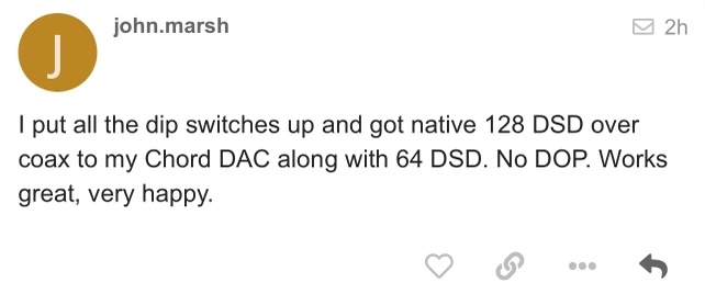 That is obvious, but what signal is being sent to the MKII? It certainly is not a DoP signal from the I²S output of the AirLens⦠and if the AirLens is fumbling the DSD256 DoP signal this could be causing your playback anomaly in Audirvanaā¦