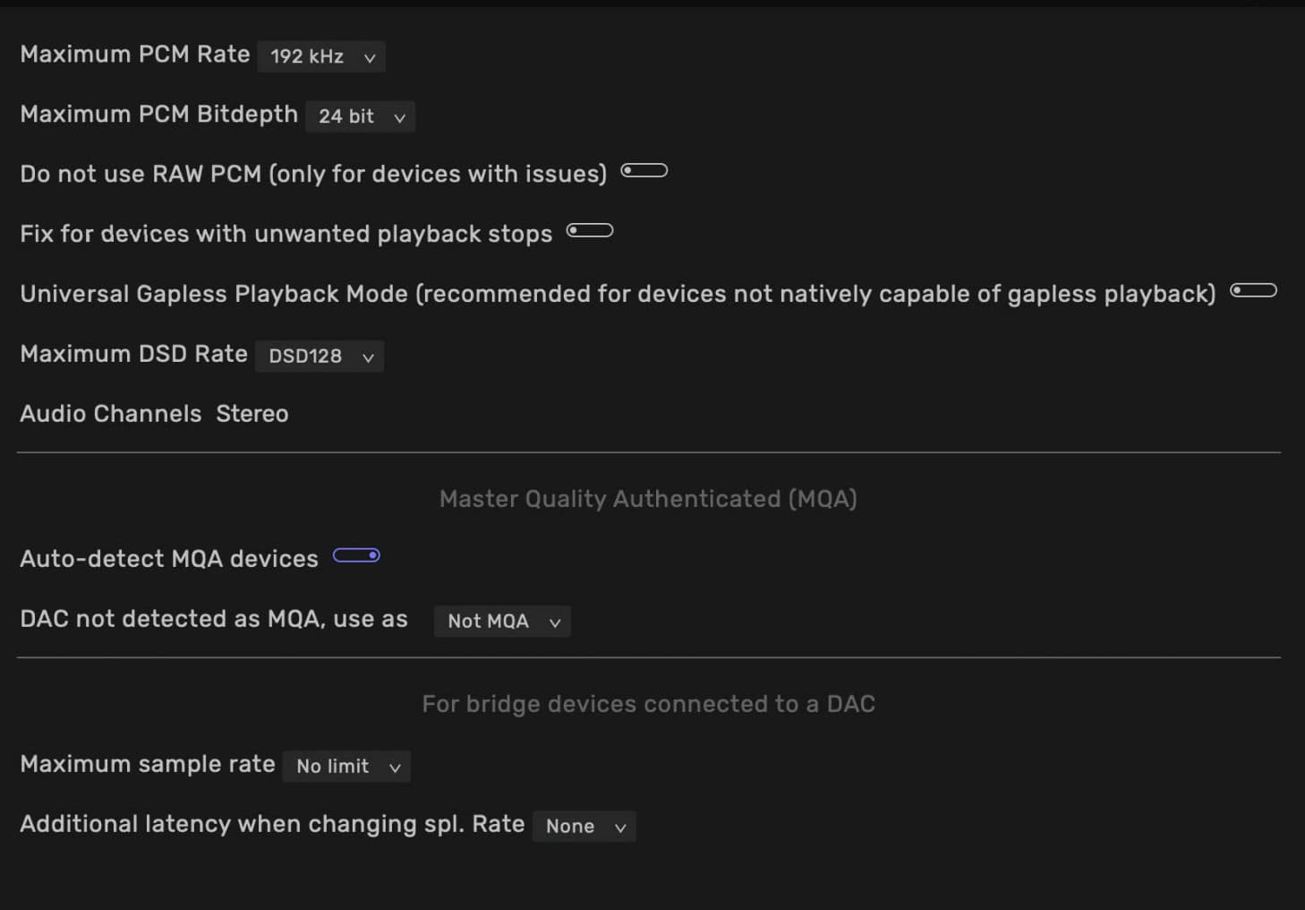 You have set the Maximum PCM Rate to 192kHzā¦The DoP PCM carrier sample-rate for DSD64 (2.8MHz) is 176.4kHz, the DoP PCM carrier sample-rate for DSD128 (5.6MHz) is 352.8kHz⦠Audirvana is converting all DSD to PCM for playback because it does not see the AirLens as DoP capable⦠Make sure the AirLens is set as the output device in Audio MIDI Setup and set to the maximum sample-rate and bit-depth of 32 bit/352.8kHz.