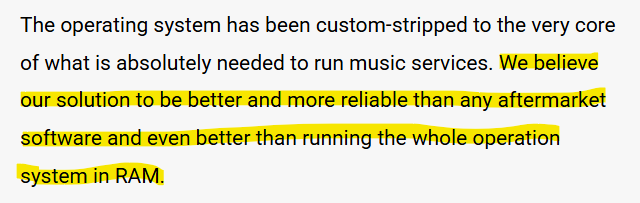 *"The operating system has been custom-stripped to the very core of what is absolutely needed to run music services."