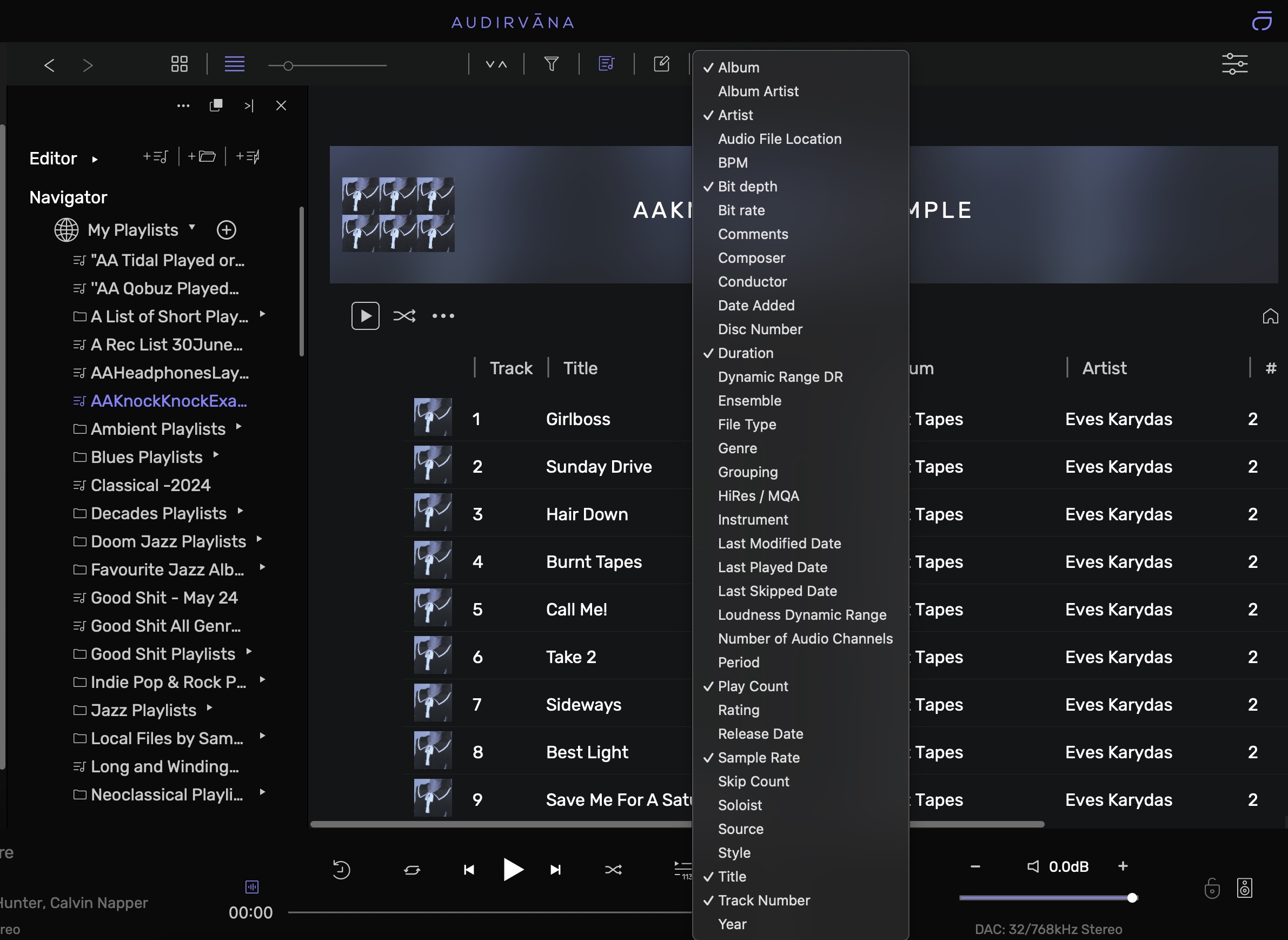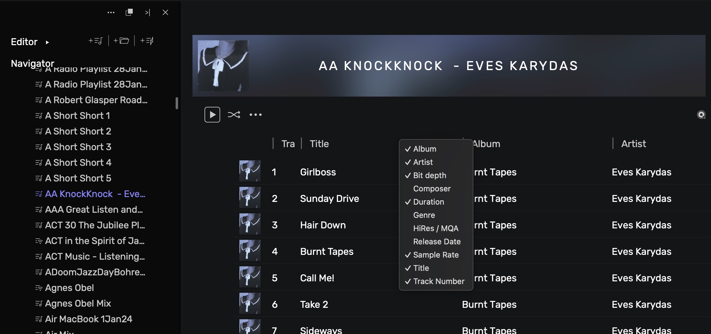 Iâve just done a simple playlist to show you on the screenshots. I just had to create the KNOCKKNOCK Playlist in my Qobuz App and got it to flow thru to AudirvÄna with a quick restart of A/S, then create the folder, bought the Eves Karydas tracks across and all the info is now available.